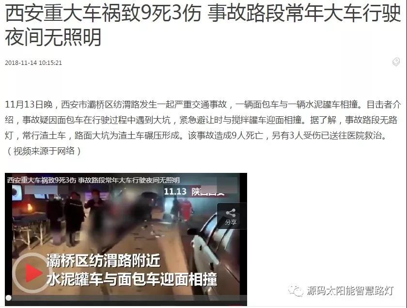 2018年11月13日晚,在西安市紡渭路新農村附近,一輛水泥罐車與一輛面包車相撞。據報道,事故已造成10人死亡,2名重傷。據附近村民介紹,這條道路經常有大型車輛行駛,并且晚上也沒有照明,使得夜間行車危險性很高。